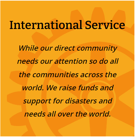 The committee is responsible for assisting the club in matters related to international service. The club has made grants to the Rotary International Polio Eradication Program, the African Child Friendly Program, a District initiative, partial funding of the Veronica project, a program promoting the visitation of students from Argentina to our community, Dominican Republic Water project, Baby Aids project Dominican Republic and Haiti Relief projects.